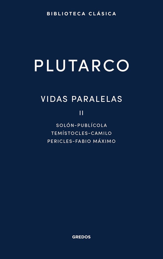En este segundo volumen de Vidas paralelas, se recogen las biografías de Solón-Publícola, Temístocles-Camilo y Pericles-Fabio Máximo. Estos seis hombres contribuyeron de forma determinante a la formación y la consagración política de las dos grandes ciudades de la Antigüedad occidental: Atenas y Roma.